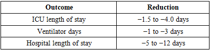 Early surgical stabilization, defined as intervention within 24–72 hours, was reported in 40–65% of patients. Delayed stabilization (>72 hours) accounted for 35–60% of cases, most commonly due to physiological instability or competing life-threatening injuries.Across multiple studies, early stabilization was associated with reduced healthcare resource utilization. Reported reductions in ICU length of stay ranged from 1.5 to 4.0 days, ventilator days from 1 to 3 days, and total hospital length of stay from 5 to 12 days compared with delayed stabilization.Table 4. Effect of early stabilization  |