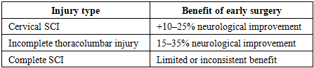 Neurological outcomes were reported heterogeneously across included studies. In patients with cervical spinal cord injury, early surgical decompression was associated with higher rates of neurological improvement in approximately 10–25% more patients compared with delayed surgery.In patients with thoracolumbar injuries and incomplete neurological deficits, neurological improvement following early stabilization and decompression was reported in 15–35% of patients.In contrast, in patients with complete spinal cord injury, early surgical intervention demonstrated limited and inconsistent neurological benefit, with most studies reporting minimal or no significant improvement in neurological status.Table 5. Neurological outcomes  |