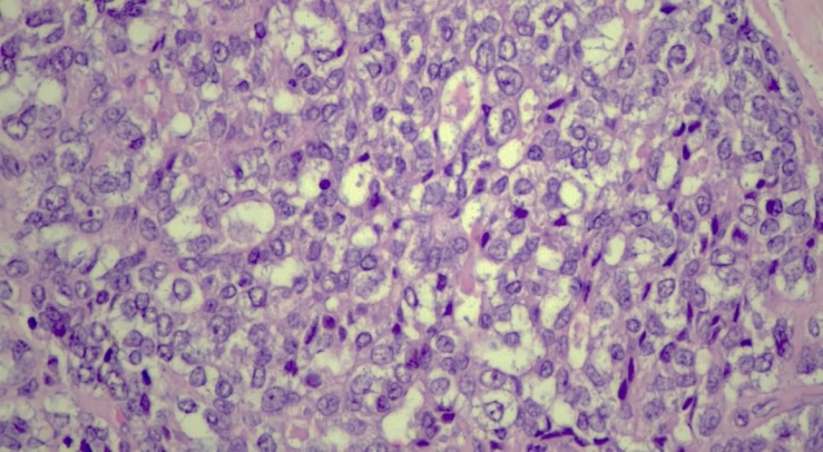Microscopy revealed extensive areas of hemorrhage in the tumor tissue. Marked lymphoid infiltration of the portal tracts was noted. The pathohistological diagnosis is epithelial type hepatoblastoma (fetal and embryonic components). This epithelial-type hepatoblastoma demonstrates a fetal "mature" pattern (the right part of the drug), passing into the embryonic "immature" zone (the left part), which clearly emphasizes the contrast between the two subtypes. Fetal areas resemble mature hepatic parenchyma and are characterized by relative cellular homogeneity, minimal atypia, rare mitoses, and tumor cells with abundant eosinophilic cytoplasm. The embryonic areas look less mature, with a high nuclear-cytoplasmic ratio, more pronounced cellular atypia and increased mitotic activity (Fig. 3).  | Figure 3. Epithelial type hepatoblastoma. Fetal "mature" pattern (right side), embryonic "immature" area (left side). Increase .x200. H&E |