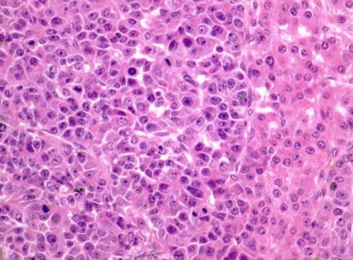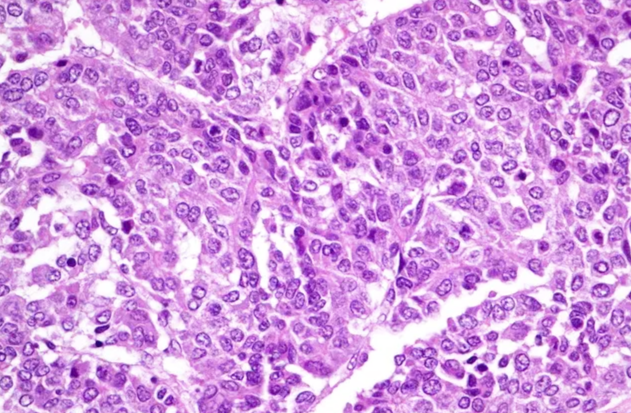 Immunohistochemical examination revealed a corresponding positive reaction with cytokeratin, EMA (epithelial membrane antigen), vimentin, polyclonal CEA (carcinoembryonic antigen), Hep Par-1, AFP (alpha-fetoprotein), alpha 1-antitrypsin, CD 99, CD 56, hCG (human chorionic beta-gonadotropic hormone), transferrin receptor and delta-like protein [7]. | Figure 2. Hepatoblastoma is a site with an embryonic component. Increase .x200. H&E |
