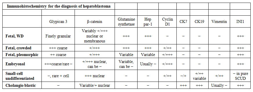 In children, liver malignancies rank third among all intra-abdominal neoplasms, after adrenal neuroblastoma and Wilms nephroblastoma.The table below presents the results of immunohistochemical analysis for the diagnosis of hepatoblastoma. | Table 1 |