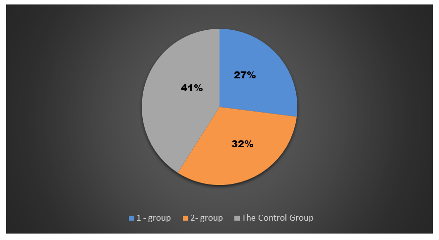 Clinical, neurological and diagnostic studies were conducted on the basis of the Department of Neurology of the RNCMPF. We examined 33 patients with a confirmed diagnosis of type 1 diabetes from 28 to 38 years old, the average age was 24.79±2.88 years, who were in a state of compensation or subcompensation of carbohydrate metabolism. Of these, there were 12 men (36.36%), 21 women (63.63%), the average duration of the disease was 24.96=3.49 years. The main group was divided into two subgroups according to the duration of the disease. Patients with DM duration of less than 3 years were included in the I-th group 15 (47%), patients with experience of more than 3 years 18 (32%) in the II-th subgroup. The control group included 23 healthy people of comparable age, on average 12.42±2.69, of whom 10 (43.47%) men and 13 (56.52%) women with undisturbed carbohydrate metabolism and without chronic and acute diseases (Fig. 1). | Figure 1. Distribution of patients by groups |