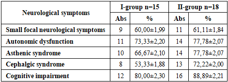 During the neurological examination of patients suffering from type 1 diabetes mellitus, various clinical syndromes of cerebral disorders were identified in patients of both groups (Table 1). The most common of which was the syndrome of cognitive dysfunction. Moderate cognitive impairment was diagnosed in the presence of complaints from patients about reduced intelligence, memory loss, unstable attention and was noted in group I in 80.00%, in group II in 88.89% of cases. The study of ANS showed dysregulation of vegetative processes in patients with both a predominance of the sympathetic and parasympathetic nervous systems. Vegetative dysfunction was observed in 73.33% of children in group I and 77.78% in group II, which manifested themselves most often in several anatomical and physiological systems and were accompanied by active somatic complaints. The asthenic symptom complex observed in patients of both groups – 66.67% and 77.78%, respectively, manifested itself in the form of increased fatigue and exhaustion, mood lability, sleep disorders. The development of this syndrome is associated with the depletion of the functional capabilities of the nervous system due to auto-intoxication, impaired blood supply to the brain and metabolism in brain tissue.Table 1. Frequency of neurological syndromes in patients with DM-1  |