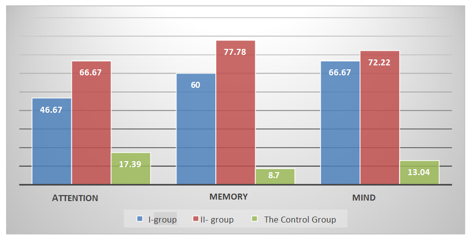 Another very common neurological disorder is cephalic syndrome, which was detected in 53.33% of the examined patients with diabetes duration less than 3 years and 72.22% of patients with diabetes experience of more than 3 years. In most patients of both groups, the structure of the cephalgic syndrome was dominated by headaches corresponding to tension headaches: dull, aching, squeezing (squeezing like a "vise" or "helmet"), more often bilateral, sometimes with a predominance in the frontal-parietal and frontal-temporal regions, sometimes radiating into the temples from both sides, the face, shoulders, which is explained by the tension of the pericranial and cervical muscles, which are intensified by psycho-emotional stress, as a rule, in the afternoon. Less often, mainly in older patients, headaches of a pulsating nature were detected: unilateral, localized in the frontal-temporal-orbital region, paroxysmal, intense accompanied by nausea, hypersensitivity to light and sound stimuli. The formation of cephalgic syndrome is caused by the disintegration of non-specific brain systems under the influence of provoking factors: stress, dishormonal disorders, as well as fluctuations in the level of glycemia. Small-focal neurological symptoms were observed in group I – 60.00% and in group II - 61.11%. The most common manifestations were in the form of fine-grained nystagmus, hyperkinesis of the tip of the tongue, diffuse decrease in muscle tone, revived reflexes, tremor of the fingers of the upper extremities and hypesthesia of the distal parts of the lower extremities. After conducting clinical trials, all patients and children from the control group underwent neuropsychological testing to study in more detail the state of memory, attention and thinking functions. Pathological and low values of attention accuracy according to 2 indicators - the volume and stability of attention in patients with DM were determined in group I in 46.67% of patients, in group II in 66.67%, memory impairment according to 7 criteria: short–term memory - the volume of reproduction of auditory-speech memory after three times repetition, the volume of delayed reproduction, the volume of short-term visual verbal memory, the volume of delayed visual verbal memory, immediate memory, operative memory, and the success of spatial memory were noted in group I in 60% of patients, in II- in the group of 77.78% of patients, there was also a decrease in 5 indicators of thinking: the level of generalization, the ability to identify specific signs, conceptual thinking, task completion time and the number of associations. In total, the average values were 66.67% in the I-group and 72.22% in the II-group. Patients of both groups were unable to achieve a 100% result when performing neuropsychological testing. The presence of cognitive deficits according to the average total values in this case has a mild and moderate degree of severity (Fig. 2). | Figure 2. Indicators of cognitive status |