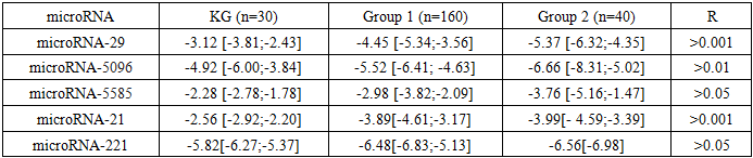 A study of microRNA expression levels revealed its direction and the pathogenetic significance of submucosal uterine fibroids. Specifically, patients with submucosal uterine fibroids in the first group showed a significant decrease in miR-29 expression by 42.6% relative to the control group, which is confirmed by published data. In the second group of patients, this decrease reached 72.1%, indicating a more pronounced dysregulation of this microRNA in the pathogenesis of the disease. Expression of miR-5096 also showed a downward trend in patients with submucosal uterine fibroids, albeit to a lesser extent. In the first group, the decrease was 12.2%, and in the second, 13.4% (P> 0.01), indicating the maintenance of molecular mechanisms that contribute to the development of uterine fibroids. Notably, the transfer of miR-5096 from glioma cells to astrocytes enhanced their invasive properties, which may indicate a potential role for this microRNA in the processes of metastasis and tumor progression. Reducing miR-5585 expression to 3.99 relative units significantly enhanced the proliferation, migration, and invasive properties of microvascular endothelial cells in submucosal uterine fibroids. This effect was achieved by suppressing cell apoptosis and reducing the production of reactive oxygen species, indicating a key role for this microRNA in regulating angiogenesis and neovascularization of tumor tissue. (Table 1).Table 1. Comparative expression level analysismicroRNA  |