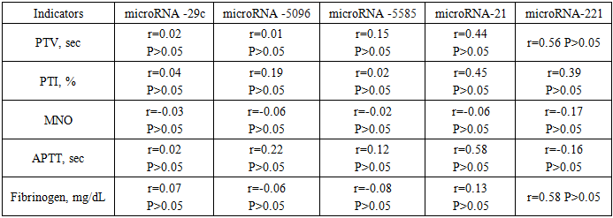microRNA-21 in patients with submucous uterine myoma, the expression level was reduced by 54.7% in patients of group 2 compared to the control, and in patients with submucous uterine myoma of group 1 by 51.5% (P>0.001), correlates with an increase in the volume of myomatous nodes - benign neoplasms of the uterus. microRNA-221in patients of group 1, the expression level was reduced by 11.3% compared to the control, and in patients with submucous uterine myoma by 12.7% (P>0.001), also correlates with an increase volume of myomatous nodes. In this study, a detailed correlation analysis of the expression of microRNA-29, microRNA-5096, microRNA-5585, microRNA-21, and microRNA-221 was performed in patients with submucosal uterine myoma. Coagulation profile, lipid profile, and hormonal status data were used for in-depth analysis, allowing for a comprehensive assessment of the relationship between microRNA expression and hemostasis parameters. Comparative correlation analysis between microRNA expression levels and coagulation parameters revealed weak direct relationships between microRNA-29 expression and prothrombin time (PT), with a correlation coefficient of r=0.22 (P>0.05). Similar trends were found for microRNA-5096 (r=0.11), microRNA-5585 (r=0.15), microRNA-21 (r=0.44) and microRNA-221 (r=0.56), which indicates a potential role of these microRNAs in the regulation of coagulation processes and may indicate their contribution to the pathogenesis of atherosclerosis. Additionally, the relationship between microRNA expression and prothrombin index (PTI) was investigated. The results showed weak direct relationships between the expression of microRNA-29 and PTI (r=0.04, P>0.05), microRNA-5096 and PTI (r=0.19), microRNA-5585 and PTI (r=0.02), microRNA-21 and PTI (r=0.45), and microRNA-221 and PTI (r=0.39). These data confirm the significance of microRNA-21 and microRNA-221 in the pathophysiology of thrombus formation and can serve as indicators of an increased risk of thrombotic complications. Thus, the conducted analysis suggests that the expression of microRNA-21 and microRNA-221 can serve as an early biomarker of atherosclerosis in patients with submucosal uterine fibroids. Further research in this area can contribute to the development of new strategies for the prevention and treatment of thromboembolic complications in this category of patients. A detailed comparison of the expression levels of several microRNAs with the international normalized ratio (INR), a key indicator of patients' coagulation status, was performed. The analysis included microRNA-29, microRNA-5096, microRNA-5585, microRNA-21, and microRNA-221. The results demonstrated the absence of a significant correlation between the expression levels of these microRNAs and the INR value. In particular, for microRNA-29, a weak inverse correlation was found with a coefficient r=-0.03, while the p-value exceeded the critical level of 0.05, indicating the statistical insignificance of this dependence. Similarly, microRNA-5096 also did not demonstrate a significant correlation with INR (r=-0.02, P> 0.05). microRNA-5585 also did not reveal a significant correlation (r=-0.02, P> 0.05). microRNA-21 demonstrated a weak inverse correlation with INR (r=-0.06, P> 0.05), which, although statistically insignificant, indicates a tendency toward an inverse relationship between the expression of this microRNA and the coagulation status. However, the weakest correlation was found for microRNA-221 (r=-0.17, P> 0.05), which emphasizes the absence of a significant relationship between the expression level of this microRNA and international normalized prothrombin time values. Thus, the conducted study allows us to conclude that there is no statistically significant correlation between the expression level of the studied microRNAs and the INR value. This fact may indicate the need for further study of the mechanisms of coagulation regulation at the molecular level, taking into account the possible complex interactions of microRNAs and other regulatory elements (Table 2).Table 2. Correlation analysis of the level of microRNA expression with coagulogram parameters in examined patients with submucous uterine myoma  |
