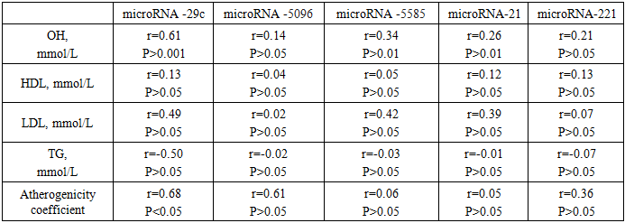 A strong direct relationship was found between the expression level of microRNA-29 and total cholesterol r=0.61 (P>0.001); microRNA-5096, r=0.14 (weak direct relationship), microRNA 5585 and OX r>0.34, (medium direct relationship), P>0.01; microRNA-21 and OX r=0.26 (weak direct relationship), P>0.01; microRNA-221 and OX r=0.21 (weak direct relationship), P>0.05. The conducted analysis of the correlation relationship between the expression level of microRNA-5096 and HDL is noted r=0.05 (weak direct relationship), P>0.05; between microRNAs-5585 and HDL is noted r=0.12 (weak direct connection), between microRNA-21And HDL is noted r=0.12 (weak direct relationship), between microRNA-221 and r=0.13 (weak direct relationship) is noted. It is obvious that between LDL and microRNA-29c, microRNA-5585 and a moderate direct association was found for microRNA-21 (r=0.49, r=0.42, r=0.39, respectively). The others showed a weak direct association. A virtually negligible association was found between TG and microRNA-5096, microRNA-5585, microRNA-21, microRNA-221, but with microRNA-29c an average inverse correlation was found r=-0.50. (Table 3).Table 3. Correlation analysis of the level of microRNA expression with lipid metabolism parameters in examined patients with submucous uterine myoma  |