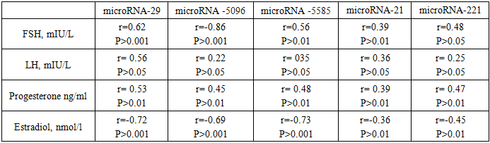 During the second phase of the cycle, dominated by progesterone, activation of myocyte mitotic activity is observed, especially pronounced in young women. Progesterone induces myoma cell proliferation, as evidenced by the high mitotic index characteristic of this phase of the menstrual cycle. There is a significant relationship between progesterone and microRNA-29, microRNA-5096, and microRNA-5585, microRNA-21, microRNA-221 direct average connection (P>0.01). Uterine fibroid tissue is characterized by a significantly higher level of expression of estrogen receptors for this reason. Between estradiol and the expression of microRNA-29 there is a strong inverse relationship r=-0.72 (P>0.001), between microRNA -5096 and Estradiol as well strong inverse relationship r=-0.69 (P>0.001) between microRNAs-5585, also a strong inverse relationship r=-0.69 (P>0.001), between microRNA-21 and microRNA-21 the relationship is somewhat reduced r=-0.36 (P>0.01) r=-0.45 (P>0.01), apparently due to a decrease in the growth of myomatous nodes.