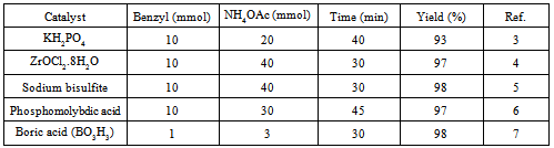 | [10] | J. N. Sangshetti, N. D. Kokare, S. A. Kotharkar and D. B. Shinde, 2008, Sodium Bisulfite as an Efficient and Inexpensive Catalyst for the One-pot Synthesis of 2,4,5-Triaryl-1H-imidazoles from Benzil or Benzoin and Aromatic Aldehydes. Mont. Fur. Chem. 139, 125 |