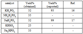 | [16] | R. S. Joshi,, P. G. Mandhan, M. U. Shaikh, R. P. Kale, and C. H. Gill, 2010, Potassium dihydrogen phosphate catalyzed one-pot synthesis of 2,4,5-triaryl-1H-imidazoles. Chin. Chem. Lett. 21, 429 |