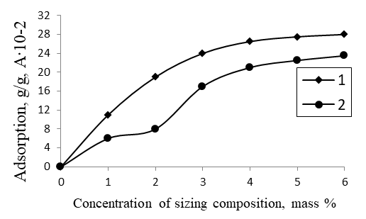 where, Pp is the breaking load at tension (cN),T is the linear density of the yarn (tex).It should be noted that the yarn sizing process is accompanied by a complex, multi–stage physicochemical interaction between the sizing compounds and the fibers. The mechanism of these interactions is largely determined by the chemical nature of the substances used, their supramolecular organization, and the structural and morphological state of the thread surface. The influence of these factors can be partially analyzed by studying the adsorption processes occurring between the sizing components and the yarn fibers, the results of which are shown in Figure 1. | Figure 1. Adsorption isotherms of the composition from aqueous solutions at 25°C; 1–Composition based on starch, NAC, and GIPAN; 2–Composition based on starch, NAC, TPFK, and GIPAN |