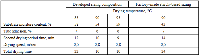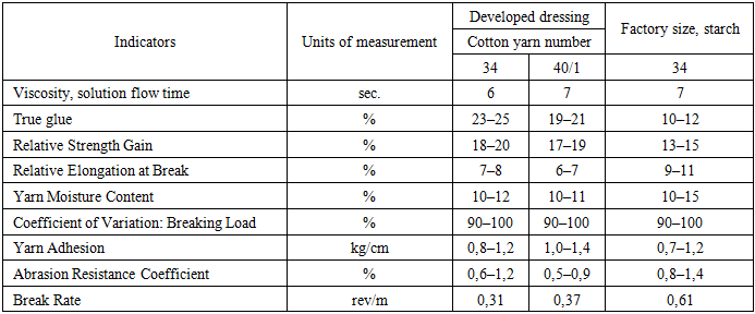 As can be seen from Table 3, the sizing concentration, which has a significant impact on cost, is 45–50 g/kg when using the developed composition, compared to 70 g/kg for traditional starch sizing. The true adhesion level remains unchanged. Experimental results showed that starch consumption is reduced by 25–30% when sizing cotton yarn using the developed compositions. This confirms the economic and environmental feasibility of using the proposed composition.