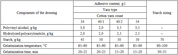 Physical–chemical properties, Mechanical properties, Yarn, Polymer compositions, Consumption, Dressing, Cotton fabric, Preparation, Breakage, Adsorption, Glue, Polyvinyl alcohol, Starch, Humidity