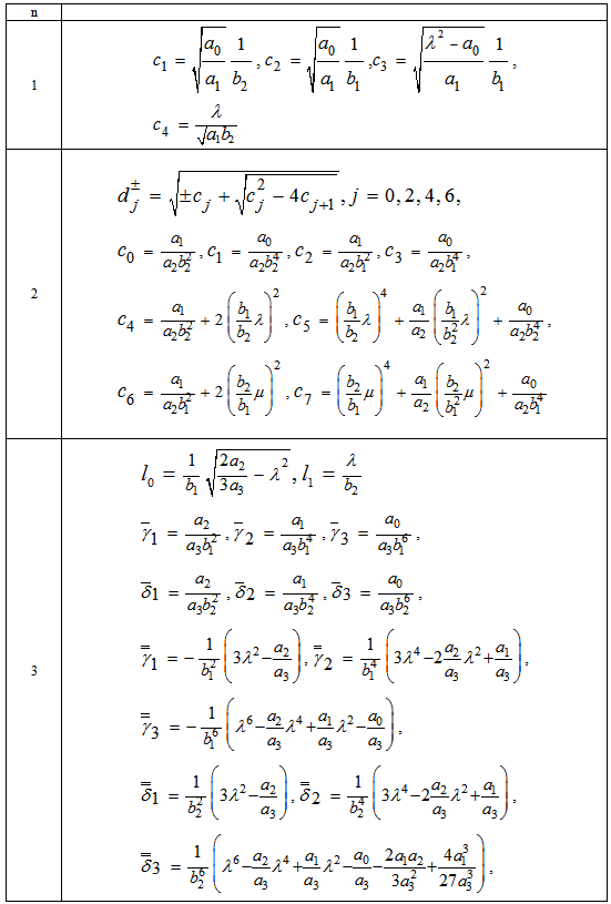 Utilizing the generalized version of variables separation introduced, solutions to equation (34) can be straightforwardly computed. Table 1 summarizes the solutions for n up to three, whereas Table 2 provides the necessary coefficients.The functions