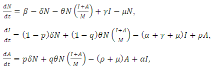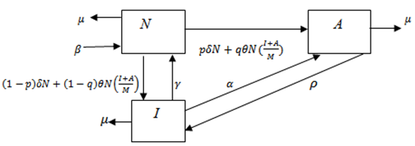 , for the number of individuals who are not aware with infant vaccination (N) which is through birth and immigration. A proportion p of unaware individuals in class N is assumed to become aware and adopt infant vaccination and progress to class A through mass media at a rate