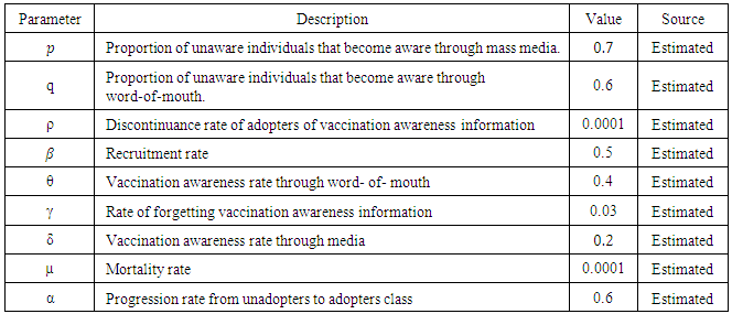 . A schematic representation of the model for the spread of infant vaccination awareness information is shown in Figure 1.![]() | Figure 1. Compartmental diagram for the infant vaccination awareness information in a population |