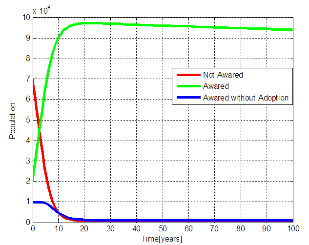 , every awared individual will cause more than one secondary awared individuals and hence the awareness information on infant vaccination will invade the population. For this study, a large number of