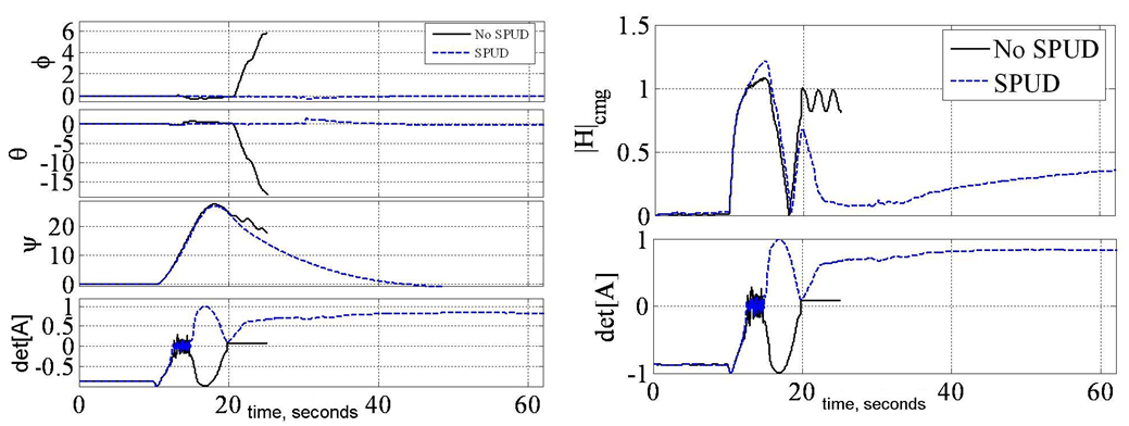 ![]() | Figure 8. SIMULATION: Comparison of gimbal angles for 50° yaw maneuver with & without singularity penetration with unit delay (SPUD) |