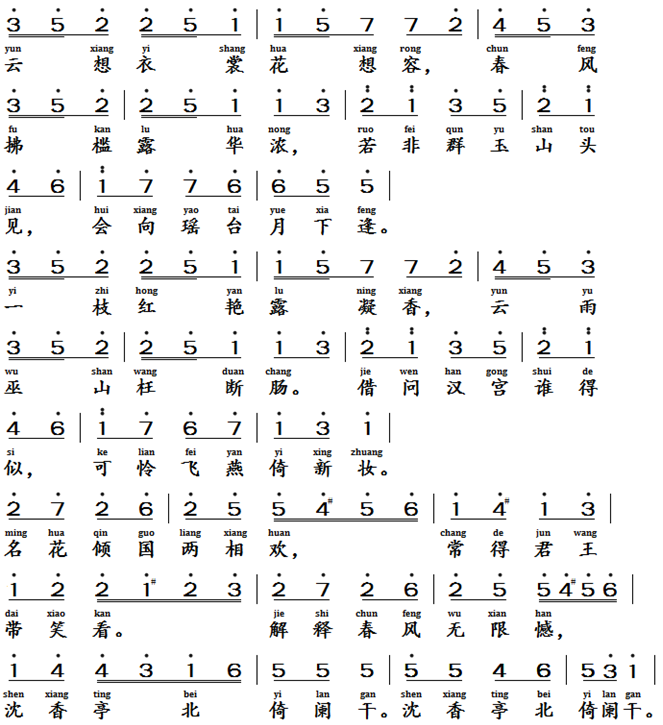 清平乐三首, 唐代, 李白 (701-762)Mellow and peaceful Song, Tang Dynasty, Li Bai (701-762 AD)Text of the lyrics清平乐三首 [2]云想衣裳花想容,春风拂槛露华浓。若非群玉山头见,会向瑶台月下逢。一枝红艳露凝香,云雨巫山枉断肠。借问汉宫谁得似,可怜飞燕倚新妆。名花倾国两相欢,长得君王带笑看。解释春风无限恨,沉香亭北倚阑干。 Translation of the Lyric (poem) Mellow and peaceful Song Her thoughts drift like clouds her beauty, like blossoms in full bloom. Spring breezes brush the balustrade; dew lies thick and fragrant upon the petals. Had she not first appeared upon the Jade Immortals’ Mountain, she surely would have graced the moonlit Jade Terrace. One branch, crimson and fragrant, bears condensed dew—clouds and rain made manifest. In the Wu mountain, such clouds and rain proved fleeting, leaving only heartache. Who in the Han Palace could rival her grace? Pitifully, she leans upon her freshly applied makeup. Famous flowers and fair land harmonize perfectly, ever capable of drawing a smile from the emperor.To express the boundless sorrow stirred by the spring breeze, one must turn to the Chilly Fragrant Pavilion, leaning silently upon its railing.