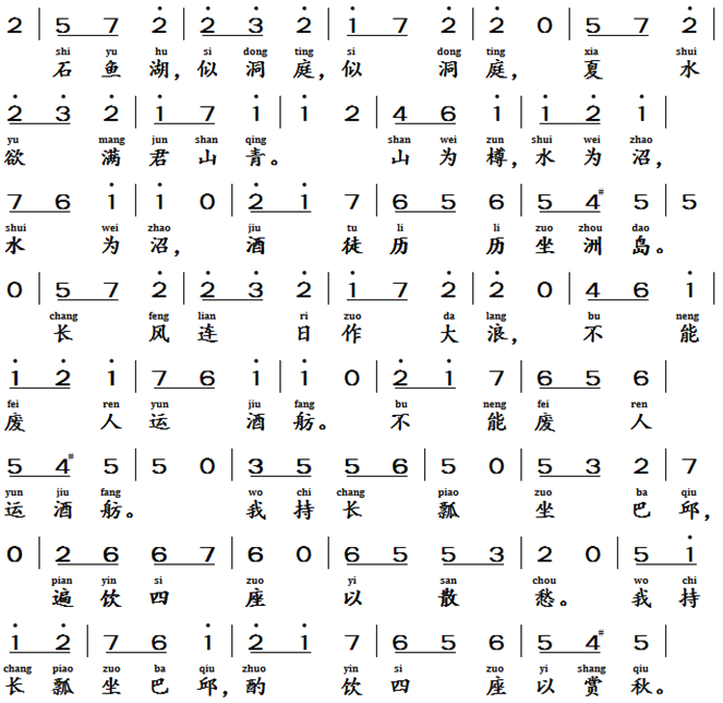 石鱼湖上醉歌, 唐代, 元结 (719 -772)Drinking Song at Shiyu Lake, Tang Dynasty, Yuan Jie (719-772 AD)Text of the lyrics石鱼湖上醉歌 [2]石鱼湖,似洞庭, 夏水欲满君山青。山为樽,水为沼, 酒徒历历坐洲岛。长风连日作大浪, 不能废人运酒舫。我持长瓢坐巴丘, 酌饮四坐以散愁。遍饮四坐同赏秋。Translation of the lyricsDrinking Song at Shiyu Lake Shiyu Lake is like Dongting Lake. In summer, when the water was about to overflow, the mountains turned green. The mountains were like wine cups, the water was like a pond. The wine drinkers sat in rows on the islands and islands of the lake.The strong wind blew for several days, causing huge waves. But no one was able to stop the boat carrying the wine. I sat on a harden hillock and held a long wine jug. I poured the wine for all the people sitting around to relieve their worries.We drank and enjoyed the autumn scenery together.