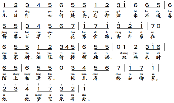鹊桥枝, 南唐, 冯延巳 (903-960)The Magpie Bridge Twig, Southern Tang Dynasty, Feng Yan Si (903-960 AD)Text of the lyrics鹊桥枝 [4]几日行云何处去, 忘却归来,不道春将暮。百草千花寒食路,香车系在谁家树。泪眼倚楼频独语,双燕飞来,陌上相逢否。撩乱春愁如柳絮,悠悠梦里无寻处。Translation of the Lyric (poem) The Magpie Bridge Twig How far has the cloud drifted in these few days? Where the floating clouds in these few days have gone? I forget to return unaware that spring is ending,On the chill of the Qingming Festival, flowers and grass line the roadside. To which tree is the ornate carriage tethered? Leaning upon the tower, I often speak through tears. Two swallows fly coming to my, I guess we ever met on the country roads.Spring sorrow stirs as chaotically as willow catkins; in endless dreams, there is no place to be found.