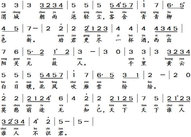 别董大, 唐代, 高适 (700 - 765)Farewell oldest brother Dong, Tang Dynasty, Gao Shi (700 -765 AD)送元二使安西, 唐代, 王维 (701 - 761)Farewell Yuan 2nd brother to Anxi, Tang Dynasty, Wang Wei (701-761 AD) Text of the lyrics别董大 [4]千里黄云白日曛,北风吹雁雪纷纷。莫愁前路无知己,天下谁人不识君。送元二使安西 [2]渭城朝雨浥轻尘,客舍青青柳色新。劝君更尽一杯酒,西出阳关无故人Translation of the Lyric (poem) Farewell eldest brother DongBeneath the sun’s fading glow, yellow clouds stretch ten thousand miles, the north wind blowing the flight geese rises, geese take flight, snow swirling in their wake. Fear not the unknown friends ahead, don’t say that there will be no close friends ahead, who in this world does not know you.Farewell Yuan 2nd brother to AnxiAt dawn in Wei City, light rain moistens the dust; the inn gleams fresh, willows wear a vivid green. I invite you Sir to drink one more cup of wine together, beyond Yang Guan Pass, no old friends you can meet.