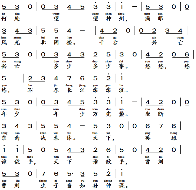 南乡子, 登京口北固亭有怀, 南宋, 辛弃疾 (1140-1207)People from the southern countryside, Southern Song Dynasty, Xin Qi Ji (1140-1207 AD)Text of the lyrics南乡子 登京口北固亭有怀 [4]何处望神州,满眼风光北固楼。千古兴亡多少事,悠悠,不尽长江滚滚流。年少万兜鍪,坐断东南战未休。天下英雄谁敌手,曹刘,生子当如孙仲谋。Translation of the Lyric (poem)Guys of northern countryside, On Visiting the Northern Fort of Jingkou with Thoughts of the Past Where can I see the land of China, the beautiful scenery of Bei Gu Tower. How many things have happened throughout the ages endlessly. The river flows on and on.At a young age, he commanded an army of tens of thousands. He dominated the southeast and never stopped fighting. Who is the enemy in the world? Cao and Liu. Expecting if you have son then who will be better similar to Sun Zhongmou.
