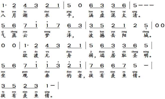 临洞庭湖赠张丞相, 唐代, 孟浩然 (689-740)Presented to Mr. Zhang, an Official of the Imperial Court, on a Visit to Dongting Lake, Tang Dynasty, Meng Hao Ran (689-740 AD)Text of the lyrics临洞庭湖赠张丞相 [2]八月湖水平,涵虚混太清。气蒸云梦泽,波撼岳阳城。欲济无舟楫,端居耻圣明。坐观垂钓者,徒有羡鱼情。Translation of the Lyric (poem)Presented to Mr. Zhang, an Official of the Imperial Court, on a Visit to Dongting LakeIn August, the lake is at its fullest, blending with the vast emptiness of the sky. The air in the Yunmeng marsh is steaming, and the waves shake the city of Yueyang.To cross the lake is impossible without a boat; to remain idle in such times is to be ashamed of the enlightened age.I sit and watch the fishermen, but all I can do is envy their success.