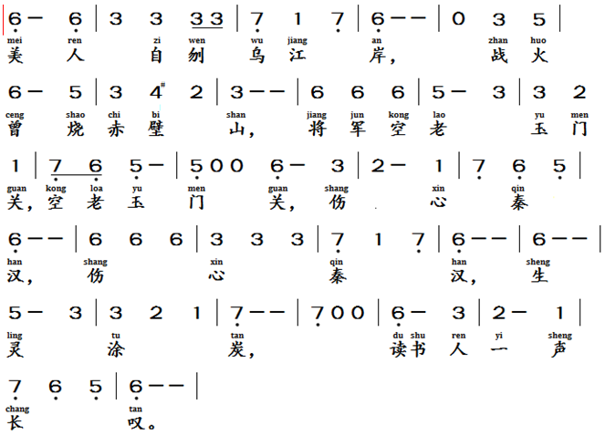 卖花声, 怀古, 元代, 张可久 (1270-1348)The sound of selling flowers, Reminiscence, Yuan Dynasty, Zhang Ke Jiu (1270-1348 AD)Text of the lyrics卖花声 怀古 [4]美人自刎乌江岸,战火曾烧赤壁山,将军空老玉门关。伤心秦汉,生民涂炭,读书人一声长叹。Translation of the Lyric (poem)The sound of selling flowers, ReminiscenceThe beautiful concubine Yu committed suicide on the shore of the Yangtze River, the war once burned the mountain of Chibi, the general get aged without military exploits at the Yumen Pass.Sorrowful Qin and Han dynasties, the people suffered greatly, it is only a long sigh of scholars of later generations.