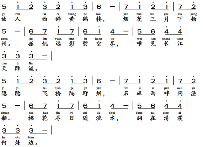 黄鹤楼送孟浩然之广陵, 唐代, 李白 (701-762)Farewell Meng Haoran to Guangling city on the Yellow Crane Tower, Tang Dynasty, Li Bai (701-762 AD)桃花溪, 唐, 张旭 (675 - 750)The Peach Blossom Stream, Tang Dynasty, Zhang Xu (675-750 AD)Text of the lyrics黄鹤楼送孟浩然之广陵 [2]故人西辞黄鹤楼,烟花三月下扬州。孤帆远影碧空尽,唯见长江天际流。桃花溪 [2]隐隐飞桥隔野烟,石矶西畔问渔船。桃花尽日随流水,洞在清溪何处边。Translation of the Lyric (poem)Farewell Meng Haoran to Guangling city on the Yellow Crane TowerMy old friend departs westward from the Yellow Crane Tower, in the fulfilled flowers and mist third month of spring, he sails for Yangzhou. His solitary sail recedes into the boundless azure sky, only the Yangtze River flows unceasingly toward the horizon line of the river and sky. The Peach Blossom StreamFar off, a bridge seems suspended above mist-shrouded fields, at the western end of the rocky pier, I ask the fisherman’s boat. Peach blossoms drift all day following the current, in this limpid stream, where lies the fabled cave.