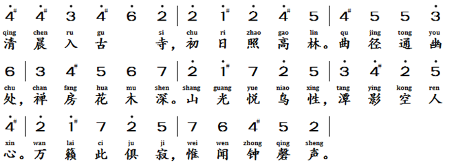 题破山寺后禅院, 唐代, 常建 (708-765) A Poem for the Rear Temple of Baishan Mountain, Tang Dynasty, Chang Jian (708-765 AD)Text of the lyrics题破山寺后禅院 [2]清晨入古寺,初日照高林。曲径通幽处,禅房花木深。山光悦鸟性,潭影空人心。万籁此都寂,但余钟磬音。Translation of the Lyric (poem)A Poem for the Rear Temple of Baishan MountainAt dawn, I enter the ancient temple; First sunlight gilds the towering trees. A winding path leads to seclusion place. The meditation hall nestles amid luxuriant blooms and verdant groves. Mountain light delights the birds’ nature, the pool’s reflection purifies the heart’s dust. All is hushed save the resonant chime of bronze gongs and bells.