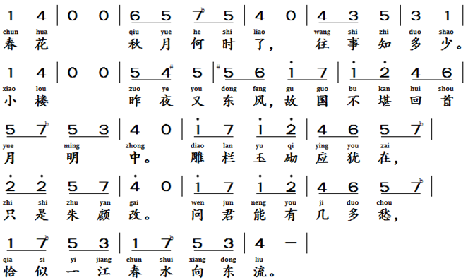 虞美人, 南唐, 李煜 (901-962 ) Beautiful concubine Yu, Southern Tang Dynasty, Li Yu (901-962 AD)Text of the lyrics虞美人 [4]春花秋月何时了,往事知多少。小楼昨夜又东风,故国不堪回首月明中。雕栏玉砌应犹在,只是朱颜改。问君能有几多愁,恰似一江春水向东流。Translation of the Lyric (poem)Beautiful concubine YuWhen will spring flowers and autumn moons cease. How many bygone events can one recall? Last night, the east wind blew again upon the small tower,in the bright moonlight of yore, I could not bear to think of my lost homeland! Marble balustrades and jade pillars surely remain,but youthful beauty has long since faded. How much sorrow can one person bear, just like a river flowing eastward, unceasing, year after year.