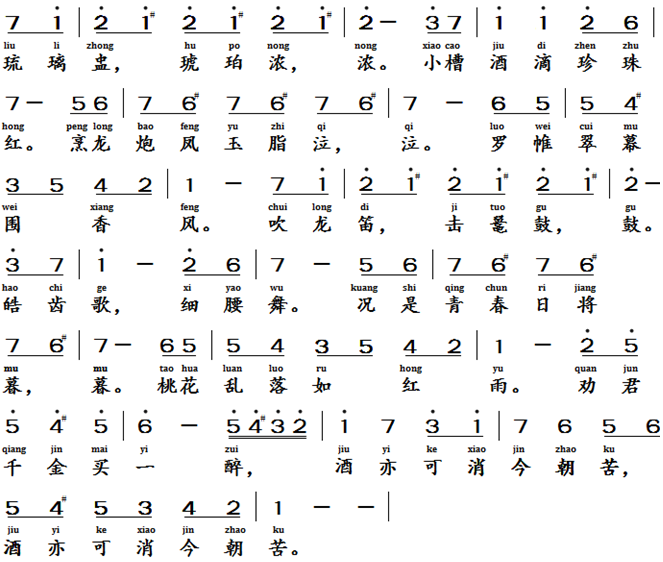 将进酒, 唐代, 李贺 (791-817) Let's Drink, Tang Dynasty, Li He (791 - 817 AD)Text of the lyrics将进酒 李贺 [5]琉璃钟,琥珀浓,小槽酒滴真珠红。烹龙炮凤玉脂泣,罗帏绣幕围香风。吹龙笛,击鼍鼓,皓齿歌,细腰舞。况是青春日将暮,桃花乱落如红雨。劝君终日酩酊醉,酒也能消平日苦。Translation of the Lyric (poem)Let's Drink Crystal goblets, amber wine, droplets of true Pearl color red dripping from the spout; Dragon and phoenix delicacies make jade-like fat weep.Brocaded curtains and embroidered screens encircle fragrant breezes. Blow the dragon flute, strike the turtle-shell drum, with pearly teeth, sing softly dance with grace. Youth fades swiftly; red blossoms fall like rain. I urge you to spend your money on just one drink, for the wine can also ease your current sorrow.