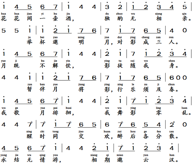 月下独酌, 唐代, 李白 (701-762) Drinking Alone Under the Moonlight, Tang Dynasty, Li Bai (701-762 AD)Text of the lyrics月下独酌 [2]花间一壶酒,独酌无相亲。举杯邀明月,对影成三人。月既不解饮,影徒随我身。暂伴月将影,行乐须及春。我歌月徘徊,我舞影零乱。醒时相交欢,醉后各分散。永结无情游,相期邈云汉。Translation of the Lyric (poem)Drinking Alone Under the MoonlightIn the midst of the flower garden, I pour a cup of wine and drink alone, without any companion. I raise my cup to invite the bright moon, and my shadow forms a trio with me. The moon doesn't understand drinking and my shadow merely follows me. I accompany the moon and my shadow for a while. Real enjoyment should be waited until the coming spring season. I sing to the moon, and it wanders; I dance, and my shadow becomes chaotic. When I wake up, we are happy together; when we are drunk, we part apart. We will forever have an unfeeling friendship, and we will make an appointment with the distant heavens.