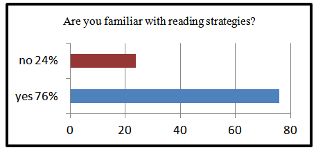 Throughout the investigation that has been made in the University of Zakho/ department of English language, it has become clear that the majority of the students from different levels are familiar with the reading strategies.As it is shown in graph (1) 76% of the students stated that they are familiar with the reading strategies. Students who are familiar with all types of the reading strategies are different from those who are unfamiliar with them or have limited knowledge about them in the way that they can organize their thoughts depending on these techniques while they read, as it was discovered when interviewing most of them. | Graph 1 |