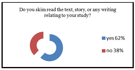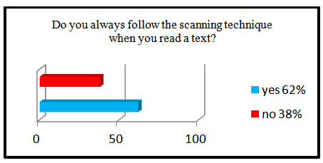 Interviewed students were asked if they are familiar with reading strategies and if they know the types of reading strategies. Most of them stated that they are familiar with the reading strategies. When this was further investigated, the majority of them could only name few reading strategies.The majority of the students were familiar with all types of reading strategies and they use them in their daily activities. However, for those who answered ''No'', when some of them were interviewed, it appeared that they only knew about skimming and scanning. This was further discussed with some of the professors and it was obvious that (4) out of (6) teachers focused only on these two strategies.One of the interview questions for the teachers was "what do you think is the best way to teach students to became aware of the most effective reading strategies? When interviewed, one of the teachers responded:"I think the best way to make students aware of the reading strategies is to teach them the strategies theoretically like skimming and scanning".Another interviewed teacher responded to the same question:"well, in my opinion the best way to teach students to become aware of the most effective reading strategies is through teaching them skimming and scanning and actually I do use these techniques with my students".The rest of the interviewed teachers collectively stated that reading strategies and techniques should be taught separately and that teachers should not only focus on some specific reading strategies but should make students aware of all the strategies related to their studies.These answers guide us to the question why did 62% of the students skim read the text, story, or any writing relating to their study and equally 62% of them said we always follow the scanning technique when we read a text. This could be because teachers at the universities in Kurdistan concentrate only on these two types of reading strategies. As it is shown in the below two graphs 2-3 respectively. | Graph 2 |