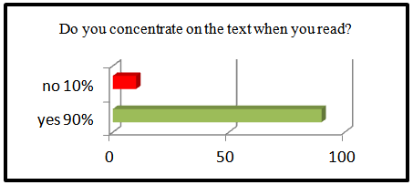 There is no doubt that concentration on the text while reading plays an important role in students' strategy of reading at college. 90% of the university students in Kurdistan concentrate on the text while they read it. Without concentration, students cannot make benefit from the text (Harmer, 2007). Reflecting on one of the interviewed students who stated that:"Without concentration one cannot understand anything from the text while reading it". As it is shown in the following graph. | Graph 4 |