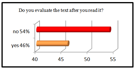 Approximately half of the students of the universities in Kurdistan evaluate the text, passage, or any piece of writing after they have read it (graph 5). This as most of them stated is regarded as a follow up activity they do to further understand the reading passage or text. When some teachers were asked about this technique, they gave two different but related reasons for conducting such a technique: the first reason was that it helps students to recognize and choose the best suited reading text for their purposes. The other reason was that such a strategy helps students critically understand the text | Graph 5 |