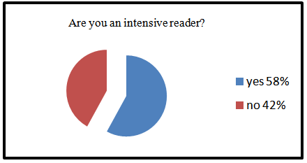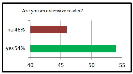 Ajideh (2003) states that readers in general will became better in their ability to make effective summaries by using their background knowledge.It is worth mentioning that students of English departments in Kurdistan study different subjects such as methodology, linguistics, literature and so forth. Despite the fact that these subjects need intensive reading, results from the questionnaire show that only 58% of the students are intensive readers while 54% are extensive readers. As it is shown in the following two graphs. Graphs 7 and 8 respectively. | Graph 7 |