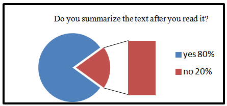 Do these two strategies of reading help students to process their subjects? This question was asked to both groups of interviewees (teachers and students). They all believed that these strategies are very effective in developing students' language abilities. They further stated that intensive and extensive reading strategies plant a desire in the students to read not only in the class but also outside the class.The technique of summarizing the text is used by students on a high level, as it is shown in graph 9. 80% of the students use it to save their time for other subjects which are based on memorization. | Graph 9 |