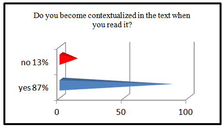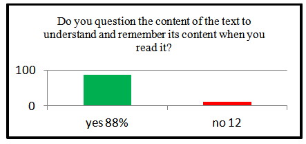Reflecting on this, Esther and Ma Noelia (2009) state that one has to completely understand the story so as to be able to tell it in his/her own words. Summarizing strategy is one of the cognitive and memory strategies which improves students' understanding of the text (Jones, 2007). Moreover, these subjects will make them predict or guess the events or analyze them from their own point of view.One of the interviewed teachers stated that:"I use "contextualizing technique" because this technique enables students to understand literary texts closely and it helps them to understand the reason why writers focus on certain ideas in the text. Another effective technique is "questioning technique" this enable students to question the reason why writers do focus on certain archaic word, difficult expressions and certain style of writing".We cannot ignore that these two techniques help students to argue and give their opinions about the reading text. The results about these two technique were the same as it is shown in the graphs (10) and (11). 87% and 88% of the student do use contextualizing and questioning techniques respectively. | Graph 10 |