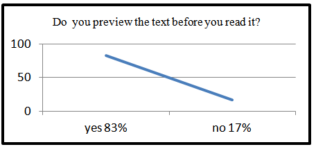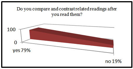 83% of the students of the English department at the University of Zakho preview the text before they read it and 79% of them do compare and contrast related readings after they read them as it is shown in the below two graphs (12 and 13). Students in English department/ University of Zakho use these techniques especially with subjects related to literature like Drama and Novel. | Graph 12 |