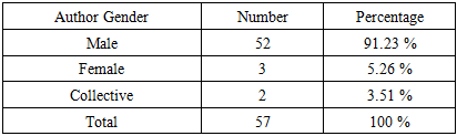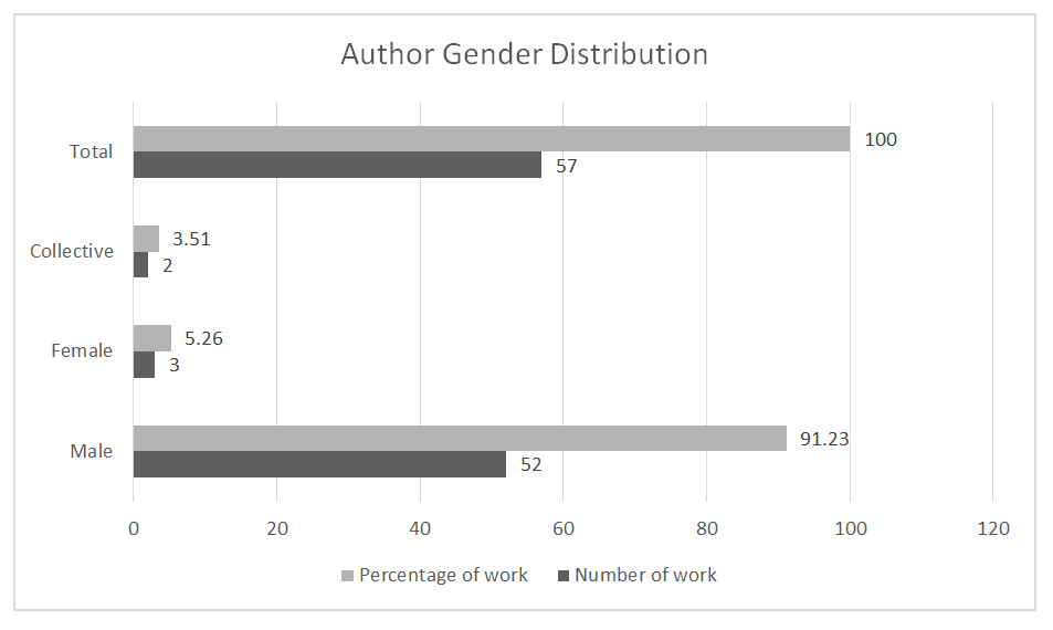| Figure 1. Author gender distribution (Bar chart): Male = 52, Female = 3, Collective = 2 |