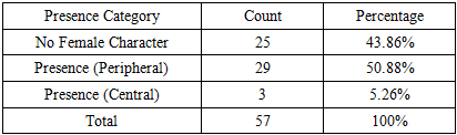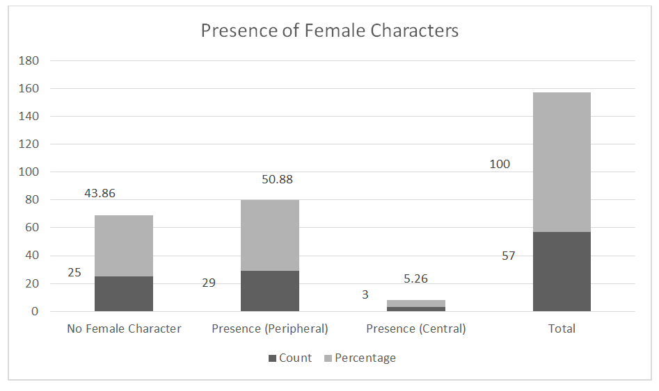 | Figure 2. Female Character Presence by their prominence (Column chart): No Female Character = 25, Presence (Peripheral) = 29, Presence (Central) = 3, Total = 57 |