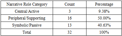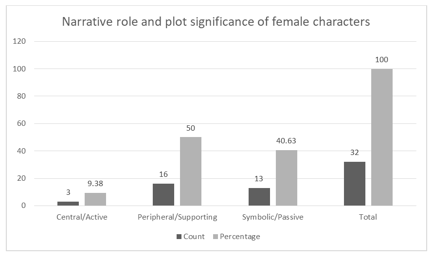 | Figure 3. Narrative Role Assigned to Female Characters (Column chart): Central = 3, Peripheral = 16, Symbolic/Passive = 13, Total = 32 |