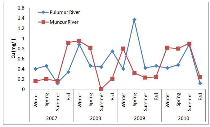 Physico-chemical parameters measured in water samples did not show the particular sources of pollution between 2007-2010. Quality monitoring results obtained that the average of surface water temperature was between 18.20℃ to 5.20℃ with the highest value of 18.2℃. The amount of Dissolved Oxygen showed the highest value as 11.67 mg /l in February 2007, and the lowest value in August 2007 (8.42 mg /l). The highest amount of Copper (Cu) ion was 0.95 mg /l in February 2008, and the lowest value was in August 2007. Nitrite, nitrate and ammonium nitrogen-containing compounds such as water quality criteria levels were found to be appropriate in Pulumur and Munzur Rivers. Sulfate inhibits the growth of phytoplankton and plants and it is an indicator of pollution caused by industrial wastes, agricultural activities and domestic waste in a variety of aquatic environments. If Sulfate content more than 250 mg /l, it indicates that contamination is more. As well as Rozan and Benoit showed that geochemical factors can affect the Cu Concentration we observed physicochemical parameters could affect the Cu concentration [17]. The value of copper (Cu) was 0.01 mg /l which 1:37 in the summer of 2009 mg /l have been analyzed. Zinc (Zn) and iron (Fe) were much lower than the measured values. The detected values of Cu were given in Figure 2 with seasonal variations. The possible cause of the increase and pollutant factors of soil, sediment, and living examples of analysis needs to be done to determine the exact reason of the Cu Pollution. Currently, work is ongoing on analysis of these heavy metals in selected rivers. Human activities such as mining activities and settlements could be possible reason. In terms of the seasonal decline in the quantity of heavy metals in the winter due to the heat of chemical reactions and less into the cause. In order to detect the accuracy of these estimates bottom sediment and living organisms could be analyzed. In addition Munzur and Pulumur Rivers should be under the protection for natural stocks of fish and other living groups for natural ecological balance. | Figure 2. The Copper (Cu) Concentration of Munzur and Pulumur Rivers between 2007-2010 |