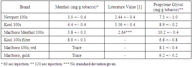 While additives to consumer products must be listed in order by amount, it is not required to report the actual amounts of these additives. Given that impacts on human health are dose dependent, knowledge of additive amounts would aid discussions of the safety of these compounds for inhalation. Additives for cigarettes include flavors, such as menthol, and propylene glycol, a humectant. Rapid determination of the amounts of menthol and propylene glycol additives in cigarettes was accomplished utilizing evolved gas analysis (EGA) – gas chromatography (GC) – flame ionization detection (FID). Careful preparation of samples and appropriate sample storage are critical components to this study. Menthol amounts in cigarettes were consistent with previous studies and this represents the first report of propylene glycol amounts.