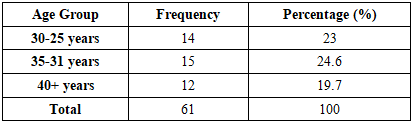 61 questionnaires were fully completed and valid for analysis.Instrument Validity and ReliabilityTo check reliability, Cronbach’s Alpha coefficient of internal consistency was computed and found to be high for all the study variables (91.1%), which is quite a good percentage compared with the least accepted level of 60%.Characteristics of the Study SampleThe financial managers of 61 small firms located within Beirut. Participant characteristics were defined by the following personal information: age, gender, and years of experience.1. GenderMost of the sample were males as they constituted 42 out of the total respondents (69%) while 19 (31 %) were females Thus it can be deduced that the position of financial manager is mostly dominated by males in most companies.2. Age The study indicates that the age group above 40 years ranked first with 33%, followed by the age group 31–35 years with 25%. Table 1 presents the distribution of participants according to age groups.Table 1. Distribution of Study Sample Members According to Age Group  |