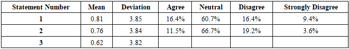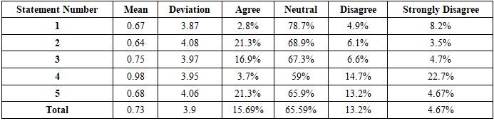 Setting up and Analyzing Indicators was measured by five statements with a mean value of 3.95 and a standard deviation of 0.75 as shown in Table 3. The highest percentage response stood at 63.9% on the option Agree followed by Strongly Agree at 19% while Neutral responses accounted for 11.5%. Minimal levels of disagreement were recorded (4.6% Disagree, 1% Strongly Disagree). The results confirm that managers see the importance that setting and analyzing indicators is emphasized especially when improvement planning for production is being set (Statement2) and programs are prepared to reduce costs as well as avoid wastages (Statement4) since there was no strong disagreement against these statements.Table 3. Describing the Statements of Total Quality Management: Focusing on the Setting and Analysis of Indicators  |