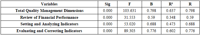Hypothesis TestingTable 6 shows results on the relationship between Combined and Individual TQM dimensions with Financial Performance (through Cost Reduction and Increased Production) in small companies in Lebanon. Table 6. The Relationship Between the Dimensions of Total Quality Management and Improving Financial Performance  |
